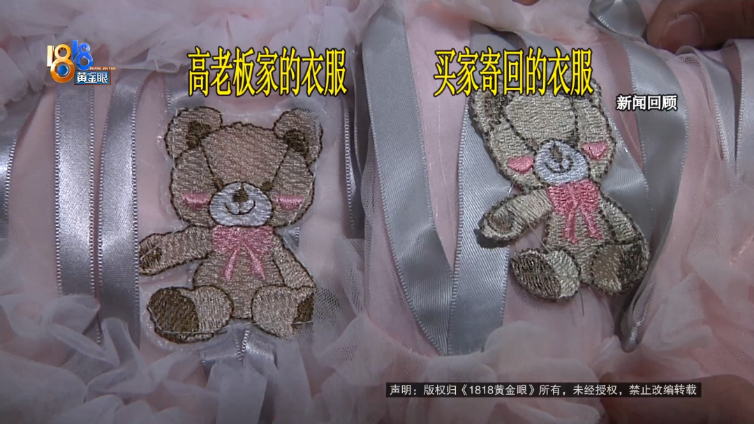 。比如这款牛仔马甲,高老板说,她家的纽扣上有英文字母,买家退回来的没有,纽扣的位置以及扣眼的样式有所不同,领标的样式位置也不一样,两件衣服的颜色有深有浅,她店里这件明显要重一些。还有这款小熊短袖,高老板认为,除了颜色不一样,她家衣服上绣的小熊更细致,也不会被丝带遮挡,买家退回的这件衣服上,爱心绣得有些歪斜。