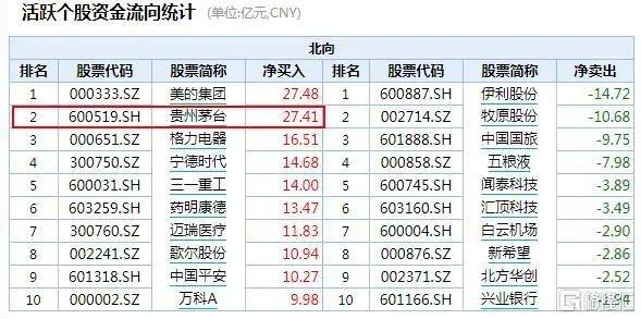 数据显示,近一个月以来,北向资金合计净流入贵州茅台27.41亿元。