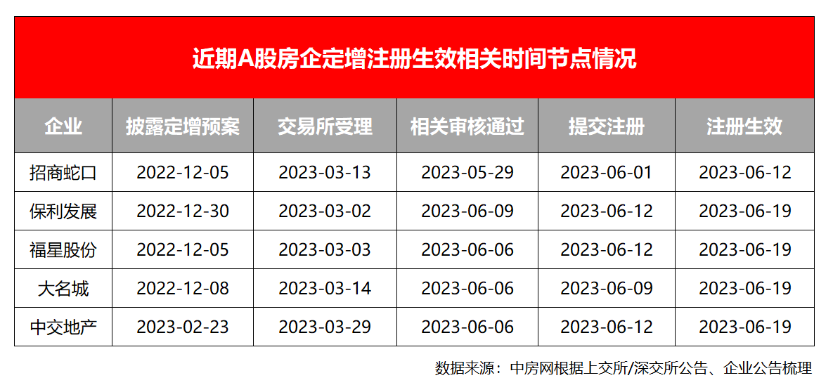 继6月16日招商蛇口公告发行股份购买资产并募集配套资金的申请获证监会注册生效后,近日又有4家A股房企定增“通关”。