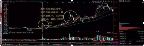 大多时候,由于许多低价筹码还掌握在散户手中,主力经常会采用“挖坑”行为,此时筹码的分布呈现从单峰密集到双峰密集再到单峰密集的分布形态,在K线上,该股的形态则呈现出一种横盘震荡时突然破位下行,并且股价向下出现了一个深坑,因此才将这种形态称之为主力吸筹的“挖坑”形态。