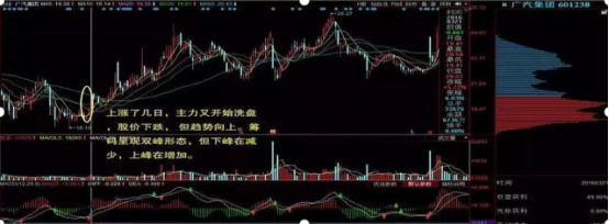 有时主力建仓过于仓促,很容易将股价急速拉高,此时获利自然缩小,但主力会再次选择在高位大量卖出,逢低再度大举进场,使得筹码在市场上大笔进进出出,显得过于凌乱,呈双峰或多峰的状态排列,此手法为典型的短线洗盘手法。