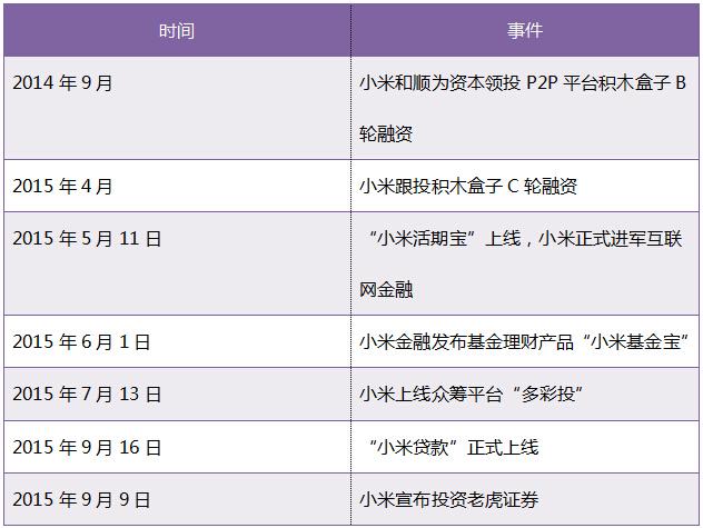 虽然如此,但似乎不影响小米在互联网金融领域的布局。根据公开资料显示,早在2014年9月,P2P平台积木盒子3719万的B轮融资,就是小米和顺为资本领投。