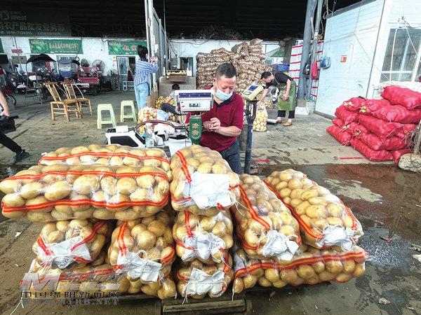 下午4时,高水农副产品批发市场依然很热闹,运送蔬菜的车辆来回穿梭,购菜的市民忙着挑选,商家忙着打包装车,土豆、南瓜、冬瓜、辣椒、大葱等各类蔬菜品类齐全、货源充足、价格稳定。