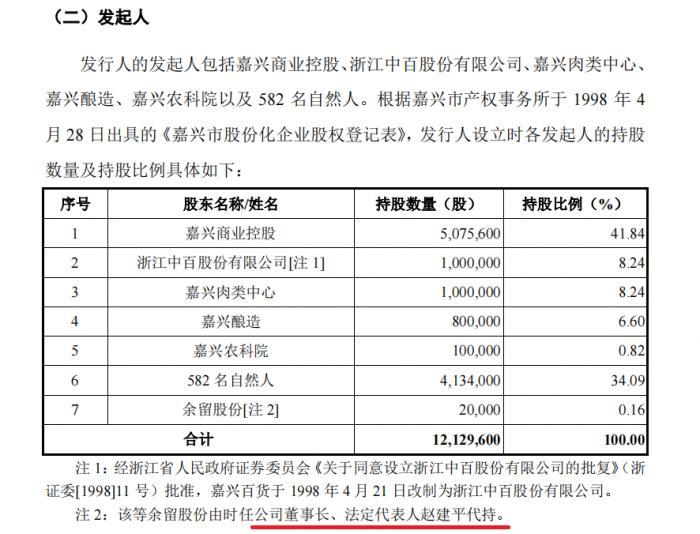 五芳斋的发起人包括嘉兴市商业控股(集团)有限公司(下称嘉兴商业控股)、浙江中百股份有限公司(注:嘉兴百货于1998 年4月21日改制为浙江中百股份有限公司)、嘉兴食品肉类中心(2001年2月14日改制为嘉兴市食品肉类有限公司,下称嘉兴肉类中心)、嘉兴酿造总公司(下称嘉兴酿造)、嘉兴农科院以及582名自然人。