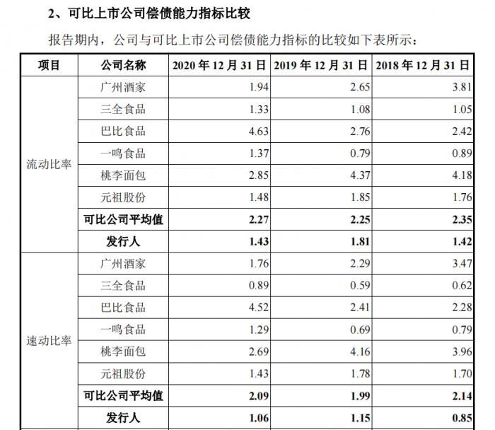 五芳斋招股说明书显示,2018年、2019年和2020年,可比公司的流动比率平均值分别为2.35、2.25和2.27,而五芳斋的流动比率是1.42、1.81和1.43;2018年、2019年和2020年,可比公司的速动比率平均值分别为2.14、1.99和2.09,但是五芳斋的速动比率是0.85、1.15和1.06。