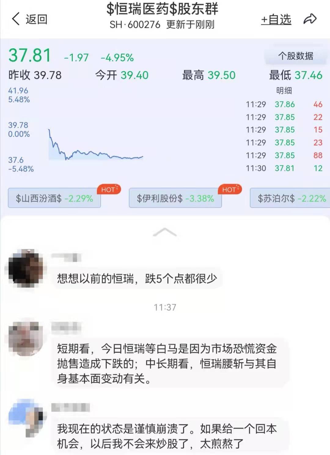 在尺度恒瑞医药股东群,有投资者吐槽道,“我现在的状态是精神崩溃了。如果给一个回本机会,以后我不会来炒股了,太煎熬了”。
