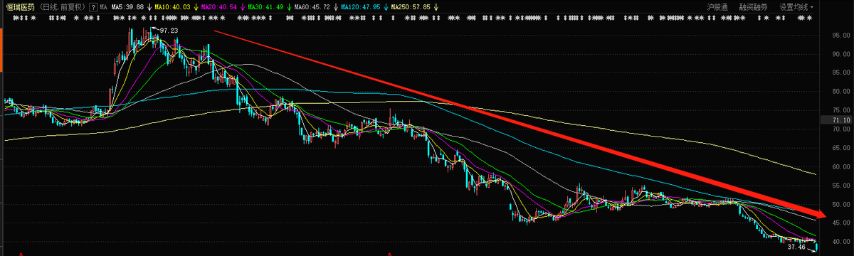 今日开盘,恒瑞医药低开低走,盘中大跌超5%,股价最低下探至37.46元,跌回到了2019年2月份时期水平。