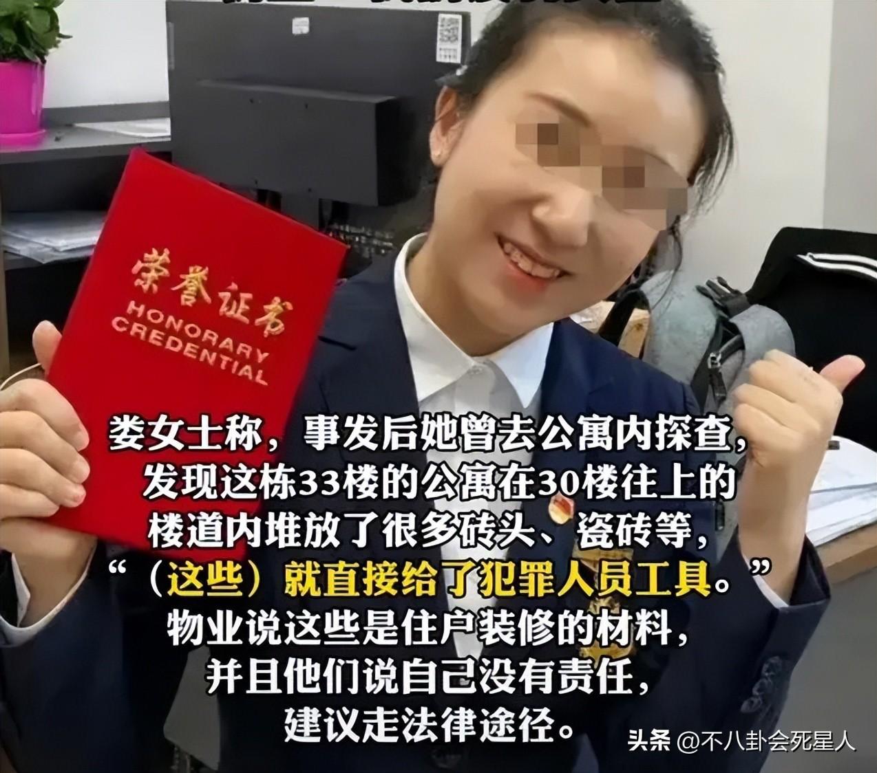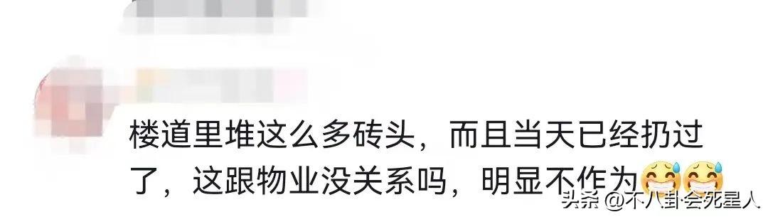 有的网友也认为,物业明显的不作为,楼道里堆了这么多砖头,而且当天已经多次发生抛物行为,但都没有警示提醒,这跟物业没有关系?还说“为啥楼顶让人随便上”。
