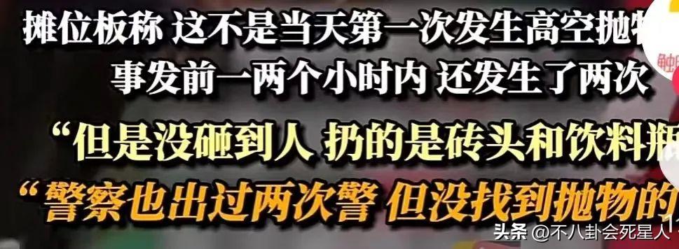 在事发前一两个小时内,此地也发生过两次高空抛物,扔了砖头和饮料瓶,报了警,警方也出了警,但抛物的人没找到。