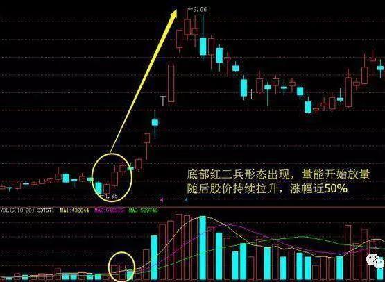 这只股票就是西宁特钢近期的K线走势图,从图中可以看出虽然前面也有出现三根阳线,但它并不属于红三兵的形态特征,而后面出现的三根阳线才是真正的红三兵形态,随着量能开始放量,股价一路拉升。从4.85迅速涨至9.06,涨幅巨大,如果你在出现红三兵的时候介入近期,那收获是非常可观的。