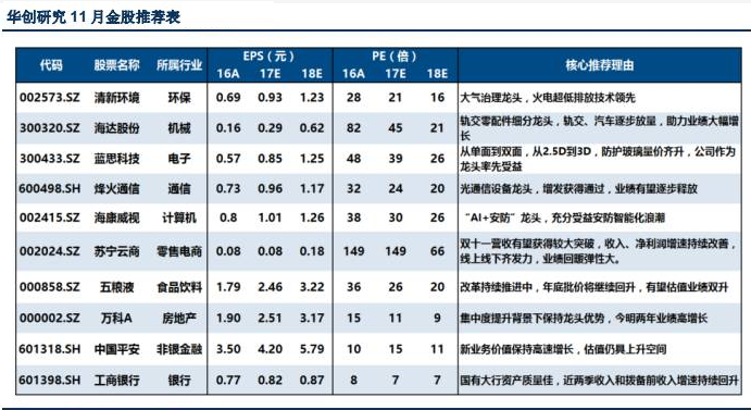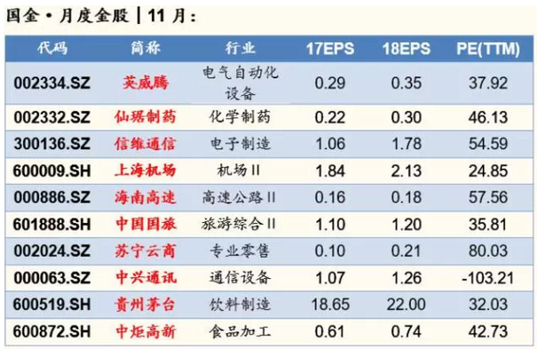 个股配置上,国金证券、华泰证券、长城证券、华创证券均公布了最新的11月金股名单。总体而言,机构看好大金融、大消费、行业龙头公司。