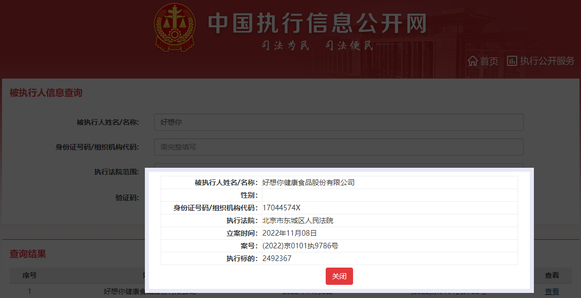 近日,中国执行信息公开网显示,好想你健康食品股份有限公司(以下简称“好想你”)新增一条被执行人信息,执行标的约249.24万元,立案时间为2022年11月8日,执行法院为北京市东城区人民法院。