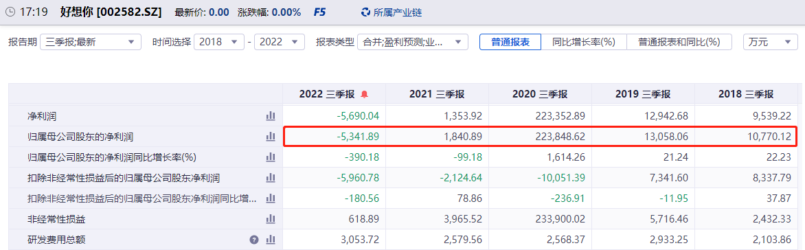 好想你近五年的三季报中,归母净利润首次出现净亏损。