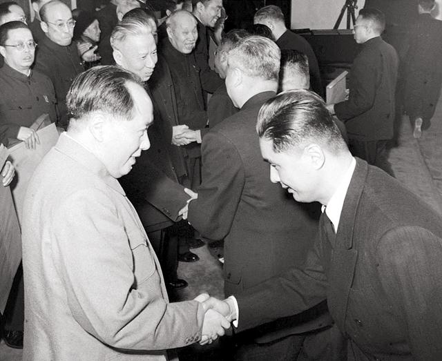 潘汉年同志向毛主席讲起荣家和荣毅仁,毛主席便亲切地与荣毅仁握了手,还向他问候起了在无锡颐养天年的荣德生老人家。