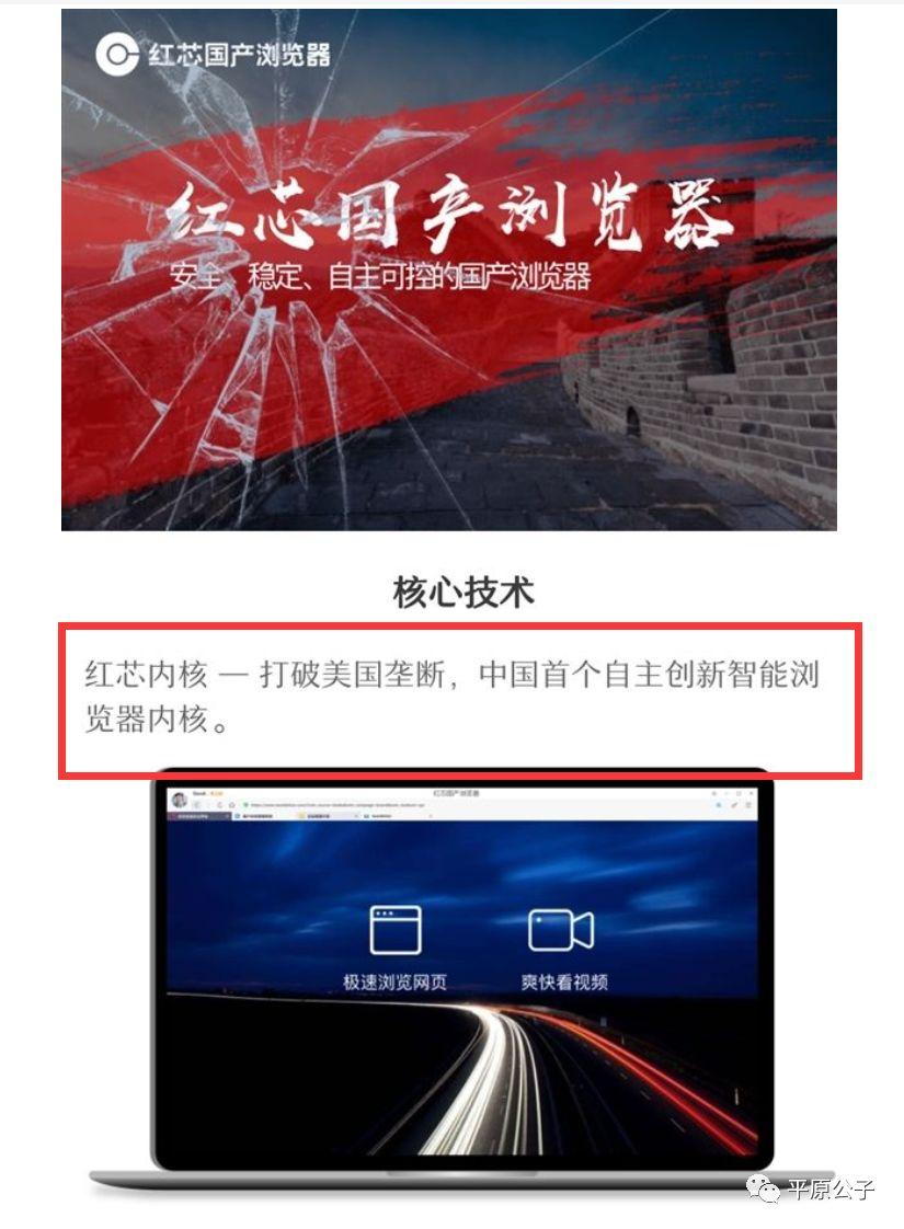 最可恨的是,红芯这颗老鼠屎,坏了中国科技的一大锅汤,中国难道就没有真正好的科技创新吗?360浏览器、qq浏览器、搜狗浏览器,都是国产浏览器,创新程度比这个换皮的红芯高到不知道哪里去了,也都是基于IE内核或Chrome内核开发的,它们在高速上网、安全、本土化等用户体验方面,还是做出了很大贡献的。但人家从来没有撒过这样的弥天大谎,说是什么独立内核、自主创新。