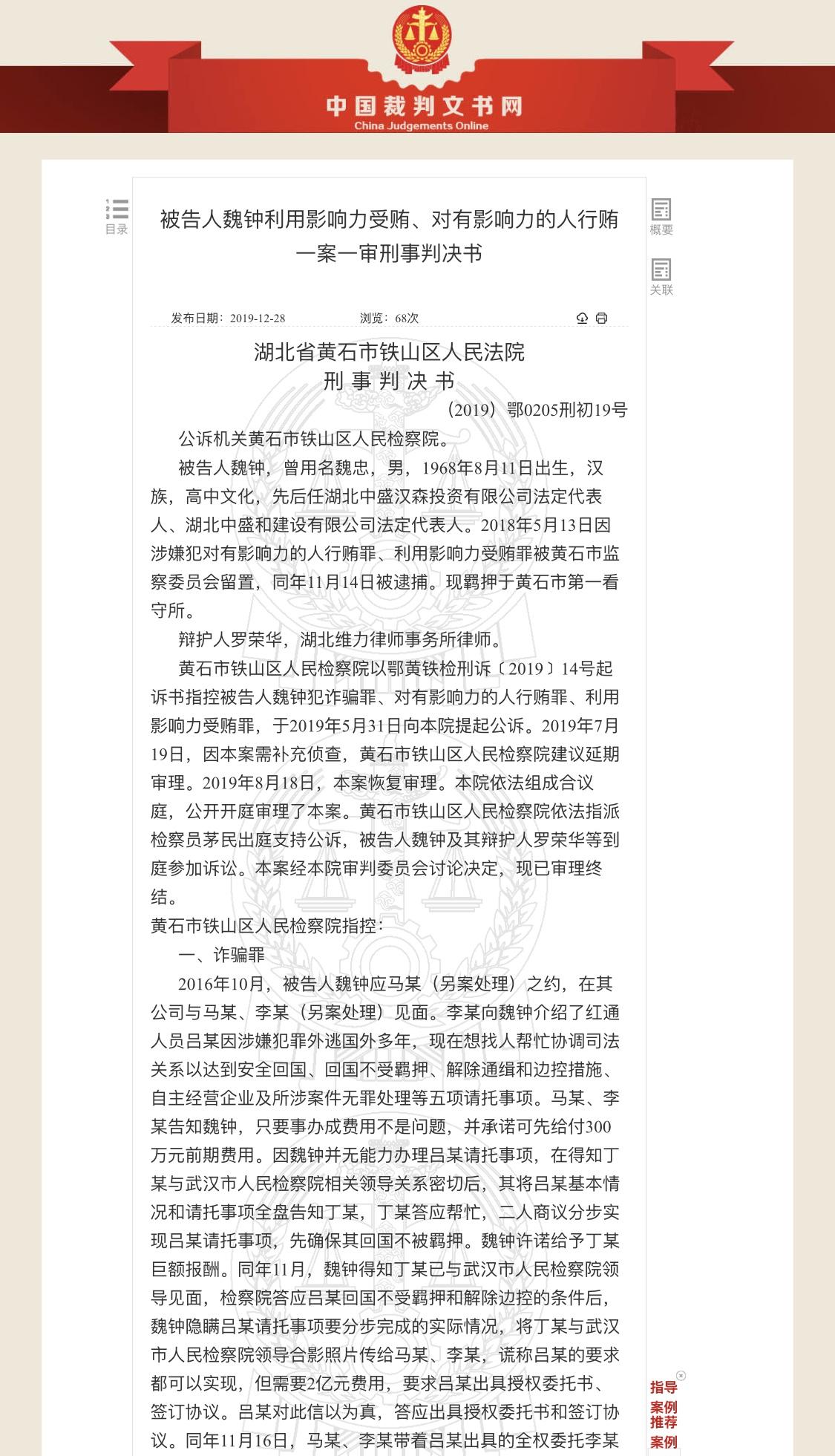 2019年12月28日湖北省黄石市铁山区人民法院公开的“被告人魏钟利用影响力受贿、对有影响力的人行贿一案一审刑事判决书”里,公开了诸多细节。