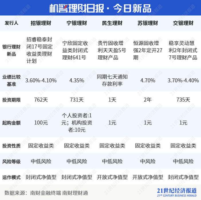 ,信银理财“安盈象固收稳健六个月持有期1号A类”和“同盈象固收稳健半年定开18号D类”分别以3.85%和3.77%的近6月年化收益率分列本次榜单的第一名和第二名。兴银理财“天天万利宝稳利8号M款”以3.67%的近6月年化收益率位列本次榜单的第三名。