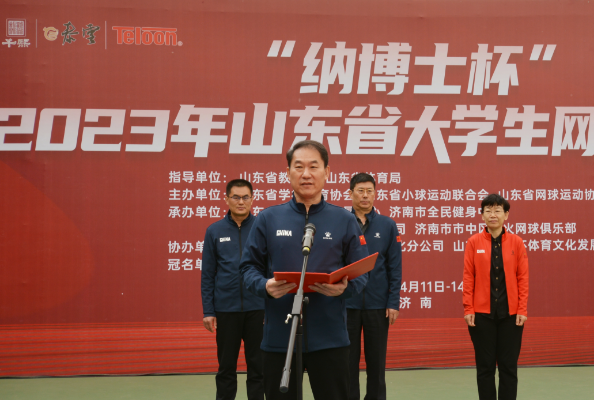 4月11日上午,“纳博士杯”2023年山东省大学生网球锦标赛在济南市全民健身中心网球场开赛。来自全省30多所高校的290多名大学生运动员将展开激烈角逐。山东省教育厅副厅长孙晓筠,山东省体育局副局长栾风岩,济南大学党委副书记杨景波,山东省教育厅体卫艺处负责人王桂龙,山东省体育局青少年体育处二级调研员申正清,山东省学校体育协会会长、山东大学体育学院院长孙晋海,山东省政协委员、山东省小球运动联合会党支部书记、主席、山东省网球运动协会会长修振涛,济南职业学院党委委员、副院长蒋雪艳,济南市全民健身中心党支部书记、主任曹培河,山东纳博士经贸有限公司董事长王汉领等领导出席开赛仪式。山东省教育厅副厅长孙晓筠宣布比赛开幕。