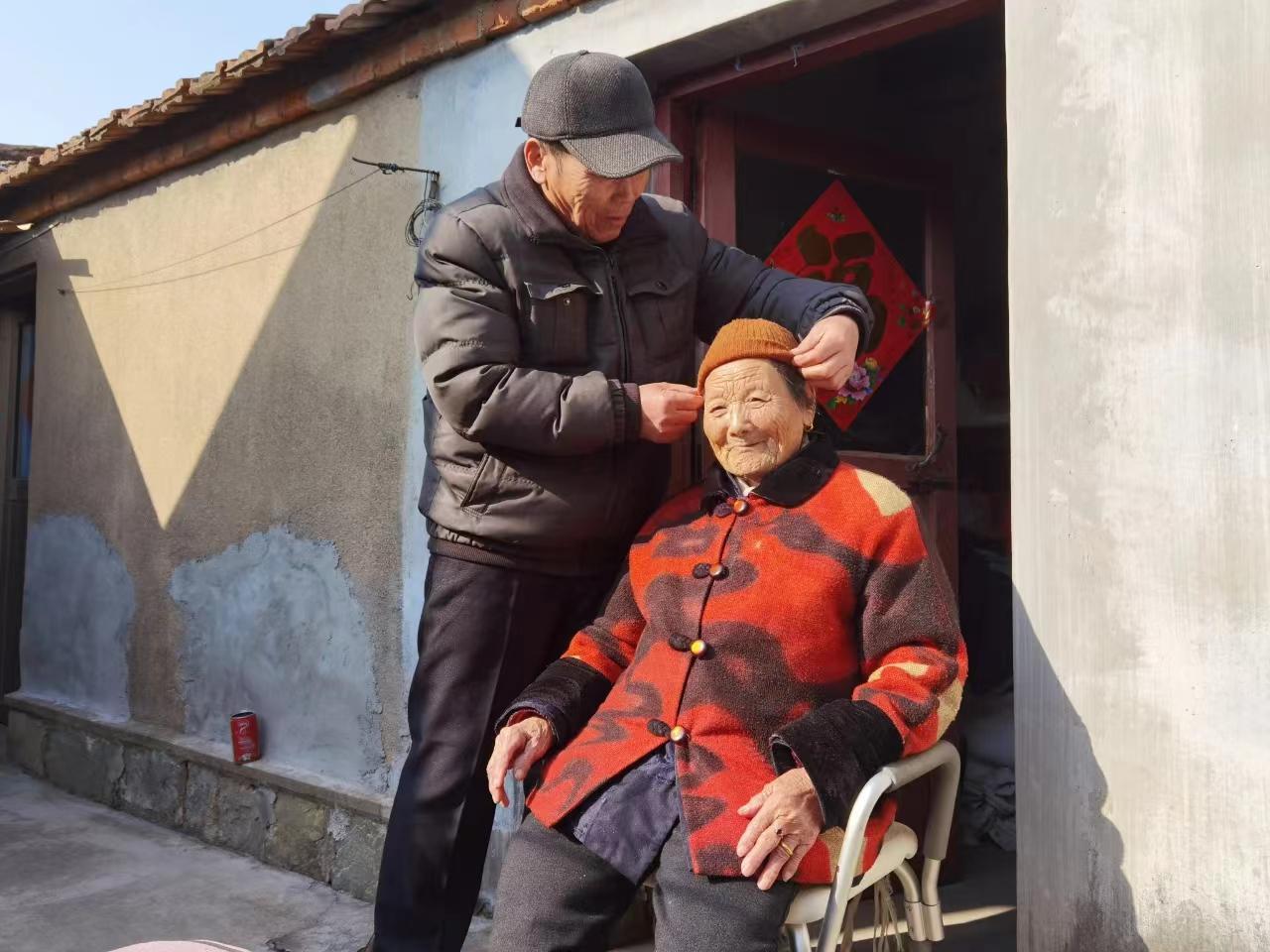 走进姚西田的家里,破旧的院落里收拾得挺整齐,角落里种着青菜,两间低矮陈旧的平房空间十分狭小,老旧的单人沙发上铺着自己用毛线织的垫子,条件十分简陋。姚西田正在照顾92岁的老母亲,他皮肤黝黑,脸上布满皱纹。因为长期的体力劳动,腰略有些弯,手上长满老茧,整个人很瘦,但是精神很好。