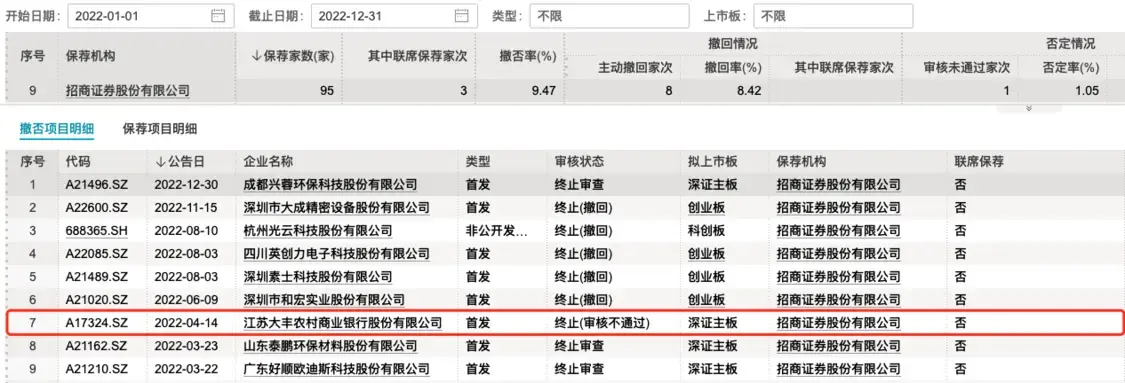 值得一提的是,去年上市被否的大丰农商行同样是由招商证券保荐。大丰农商行也是A股历史上首家被否的银行IPO。