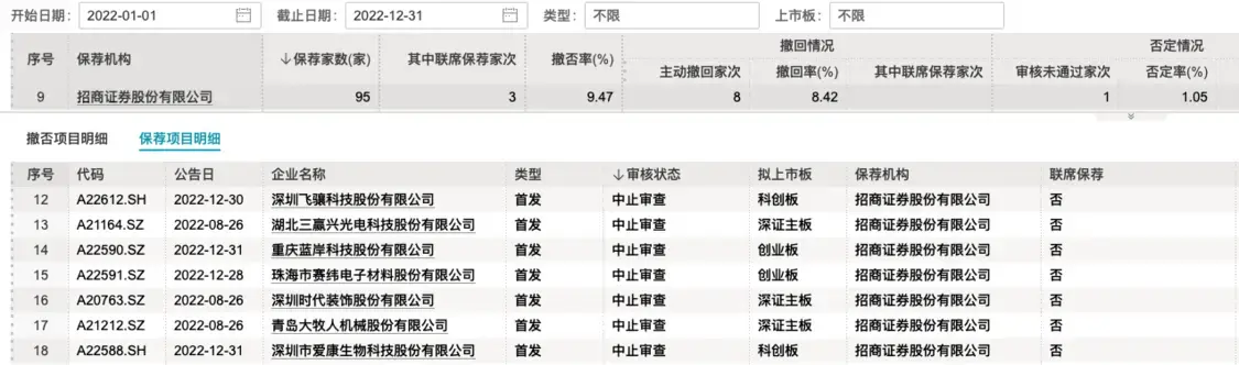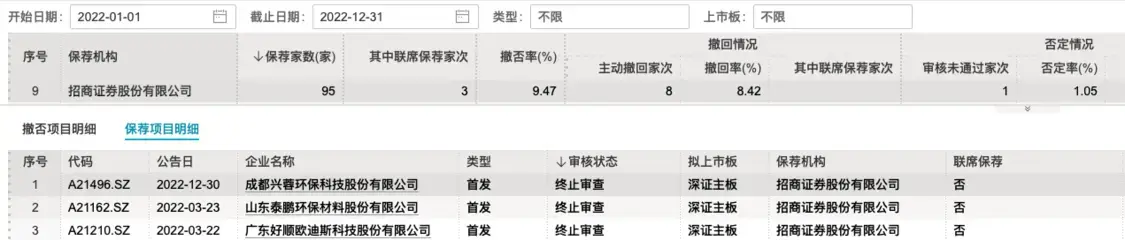 2022年,招商证券保荐的IPO项目中,还有7个处于中止审查状态,包括2个科创板、2个创业板和3个深证主板。