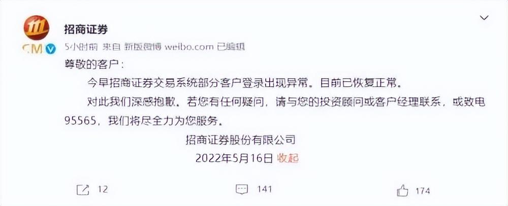 仅仅两个月后,招商证券系统再次崩溃。5月16日,有大量投资者反应,招商证券交易系统在电脑端和手机端均无法登录,导致许多投资者交易暂停。