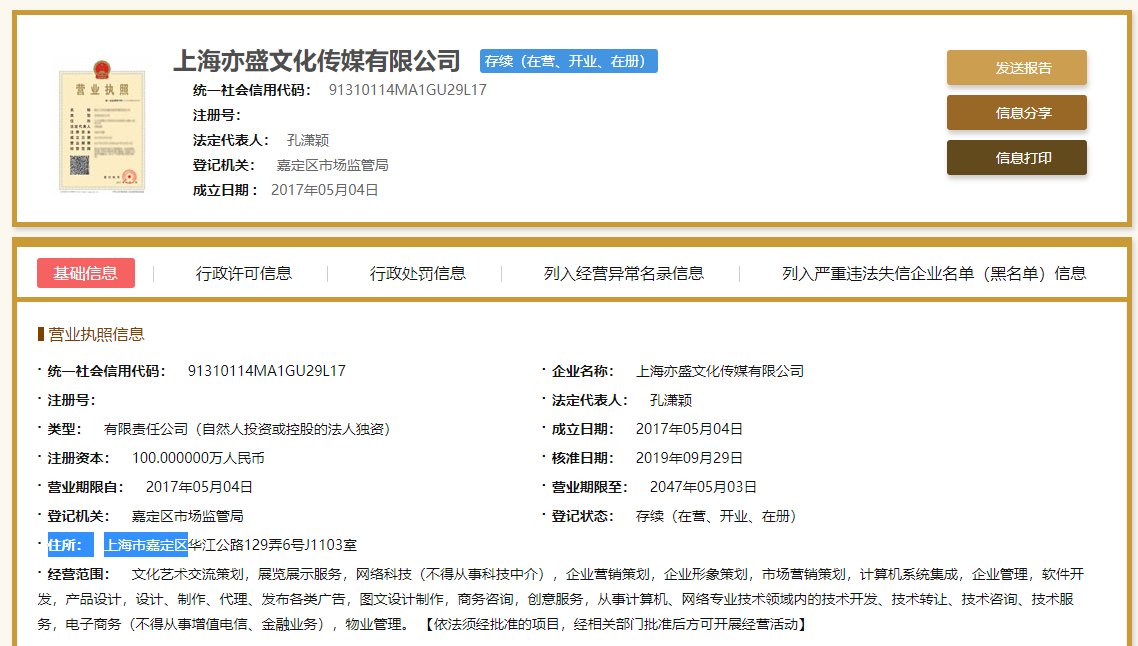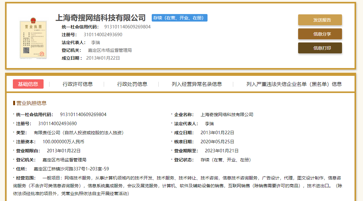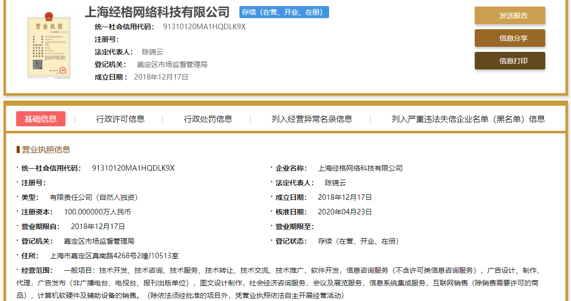 国家企业信用信息公示系统显示,经格网络科技有限公司、奇搜网络科技有限公司、亦盛文化传媒有限公司均注册在上海市嘉定区。其中,经格网络科技有限公司在普陀区设有经营场所。