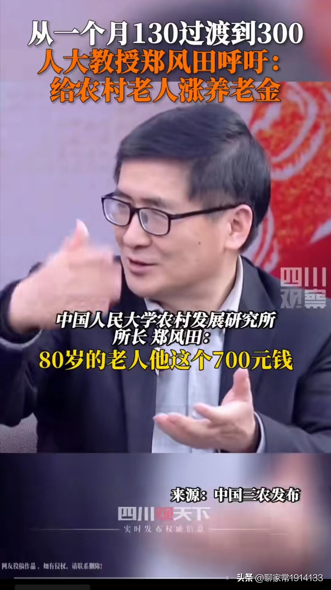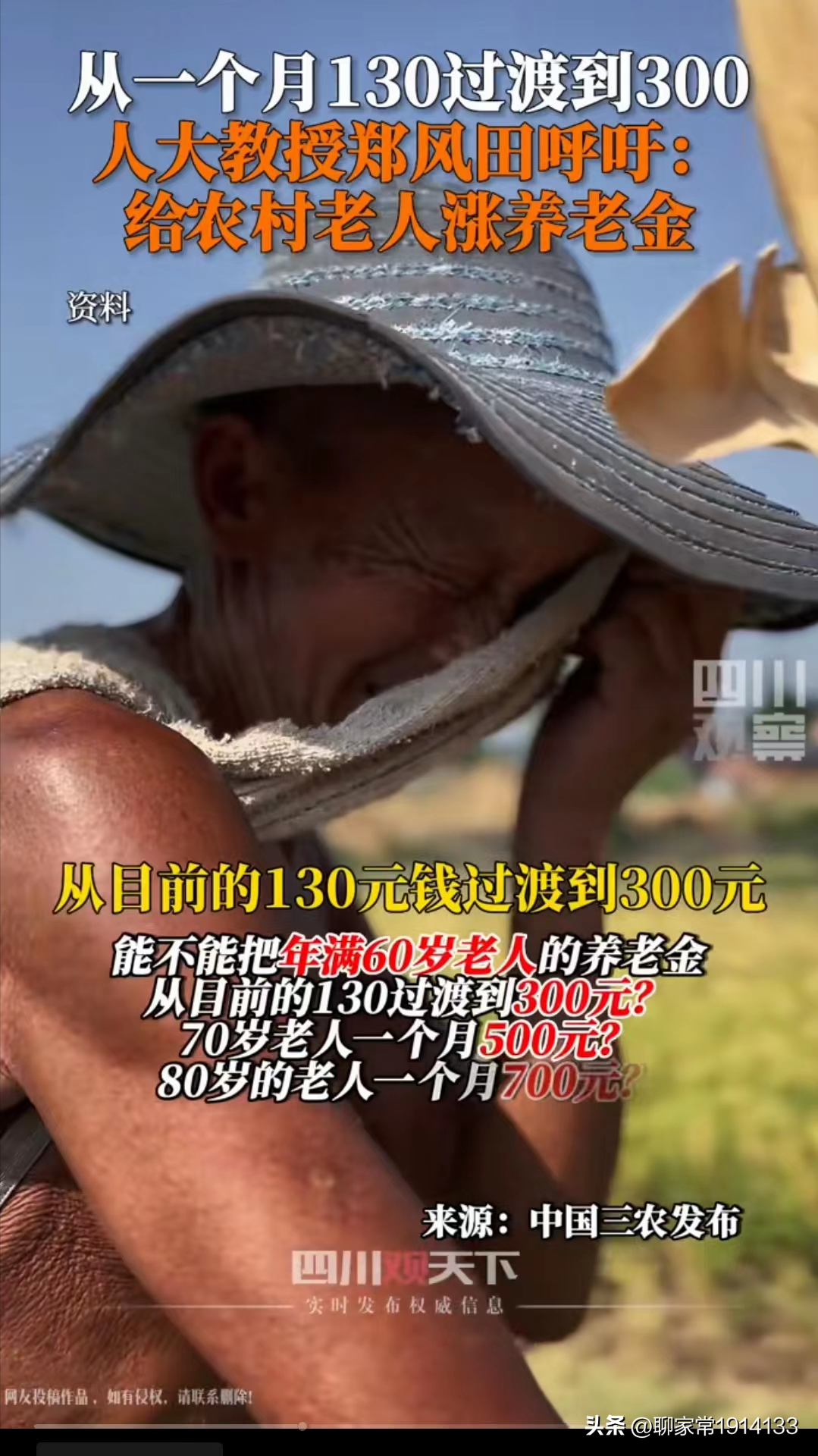 中国三农发布:郑风田在一采访中谈到,目前60岁以上的农村老人,大概在1.3亿人以上,他们的养老金太少了,能不能从目前的130元钱过渡到300元;70岁老人一个月500元?80岁的老人一个月700元?