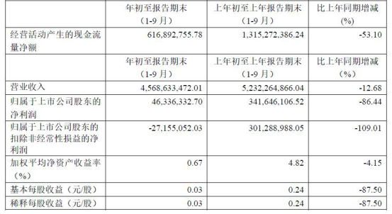 10月30日,鹏博士披露2019年前三季度业绩,1-9月公司实现营业收入45.69亿元,同比下降12.68%,归属于上市公司股东的净利润为4633.63万元,同比大幅下降了86.44%。经营活动产生的现金流量净额为6.17亿元,同比下降了53.10%。