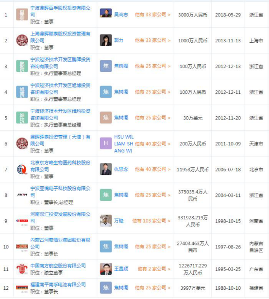 天眼查显示,宁波亚锦电子科技股份有限公司(简称亚锦科技)的法定代表人为焦树阁,曾有媒体称焦树阁是鼎晖投资总裁焦震的别名。焦树阁在宁波鼎晖百孚股权投资有限公司、上海鼎晖赋泰股权投资管理有限公司、鼎晖晖泰投资管理(天津)有限公司、河南双汇投资发展股份有限公司担任董事,同时还是内蒙古河套酒业集团股份有限公司、福建南平南孚电池有限公司的董事长。