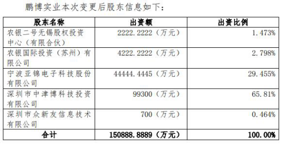 2019年8月27日,亚锦科技公告称,公司与鹏博实业签订《关于调整宁波亚锦电子科技股份有限公司与深圳鹏博实业集团有限公司增资安排的协议书》,根据协议约定,公司向鹏博实业增资的金额从15亿元调减至10亿元,其中4.44亿元作为鹏博实业新增注册资本 ,剩余5.56亿元计入鹏博实业的资本公积,公司持有鹏博实业29.455%的股权,增资款已由公司向鹏博实业全额实缴。目前该项对外投资事项已经完成工商备案登记。