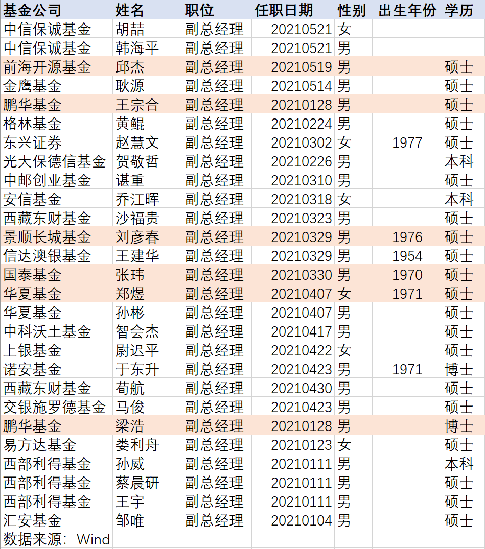根据资事堂统计,2021年初,已经有34家基金公司的副总经理发生“更迭”。其中多位由明星基金“进阶”成副总,包括景顺长城基金