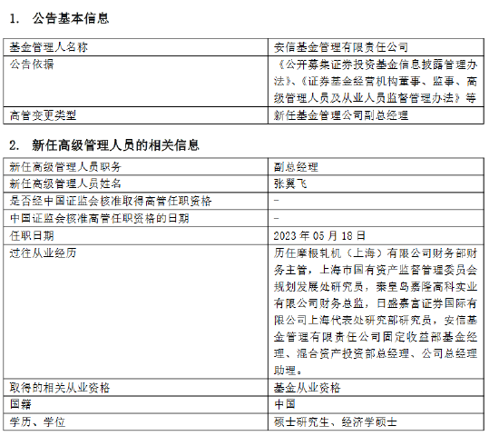 近日。安信基金公告称,新任张翼飞为公司副总经理,任职日期2023年5月18日。
