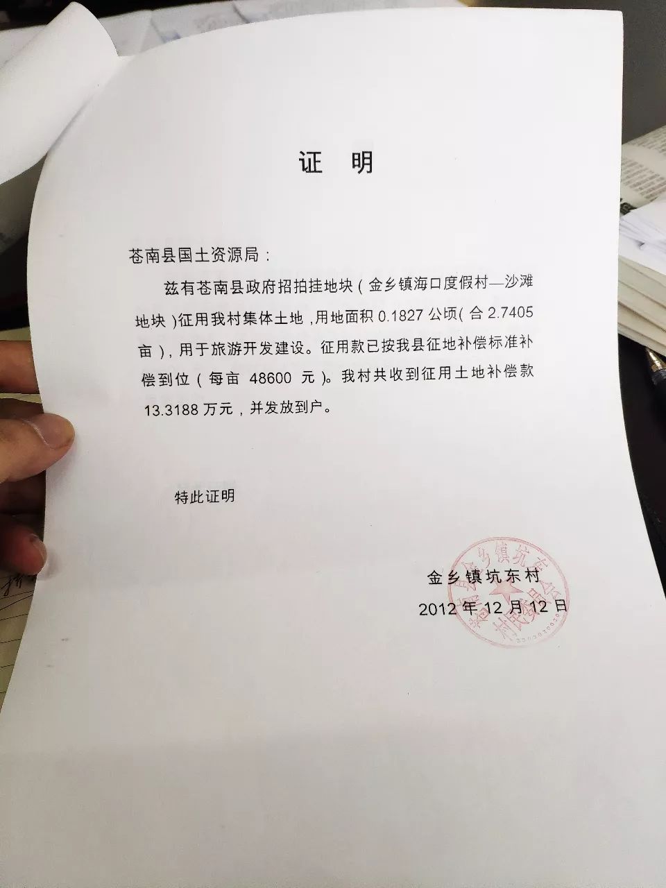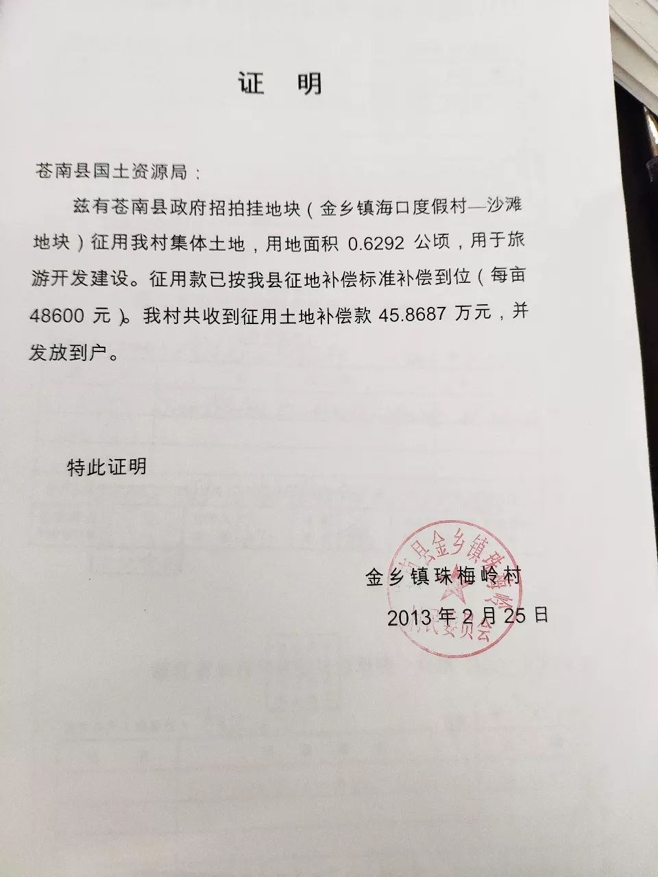 档案资料显示,在征收土地款发放环节,海口村、珠梅岭村和坑东村事后均向苍南县国土局出具了证明,表示征收土地款已收到,并发放到户。同时,三个村子还开出了征收土地款已入账的收据,加盖了公章。
