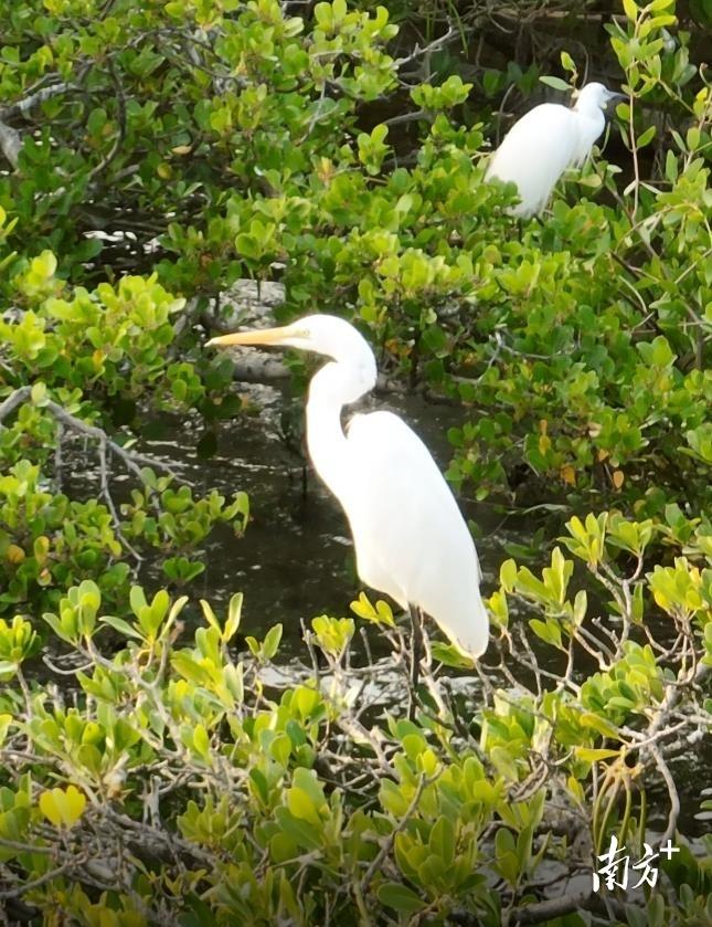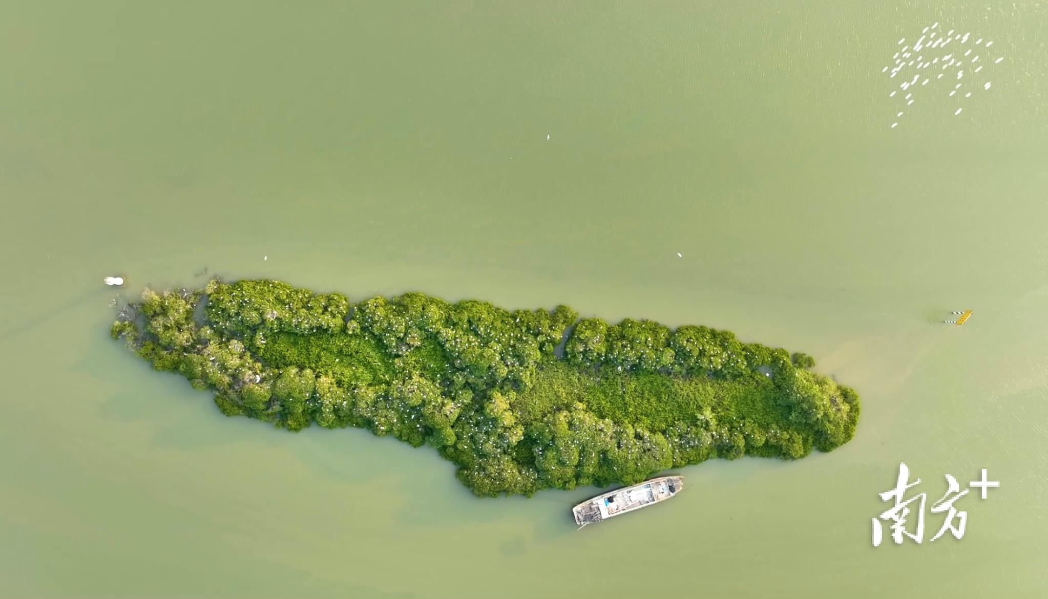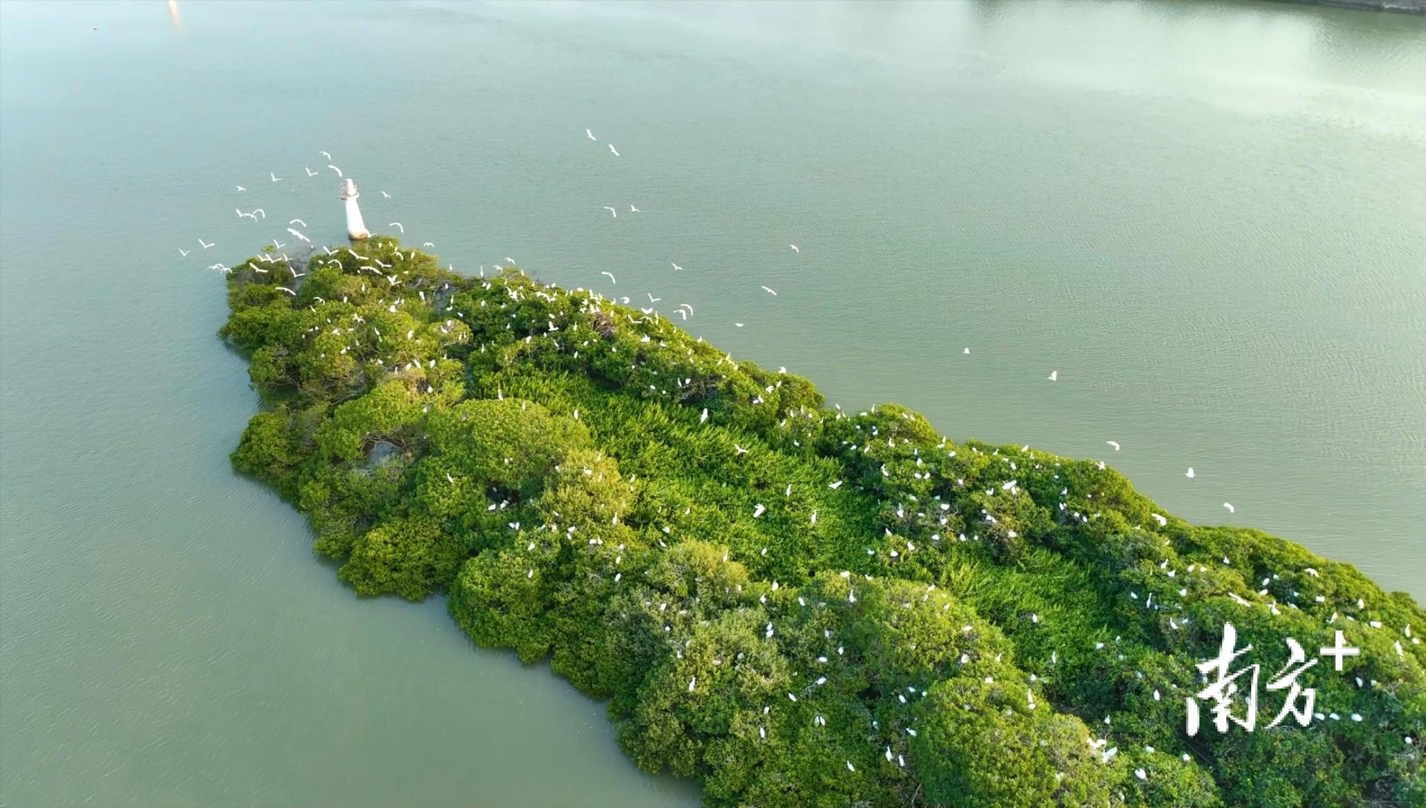 记者观察到,眼前的“鹭岛”是一个漂浮在海面上的沙洲,表面已完全被红树林植被覆盖。从上空俯瞰,茂密的红树林不仅在这片海面上镶出了一道美丽的绿色风景线,还给鸟类提供了栖息地。除了白鹭,还有不少红嘴鸥。