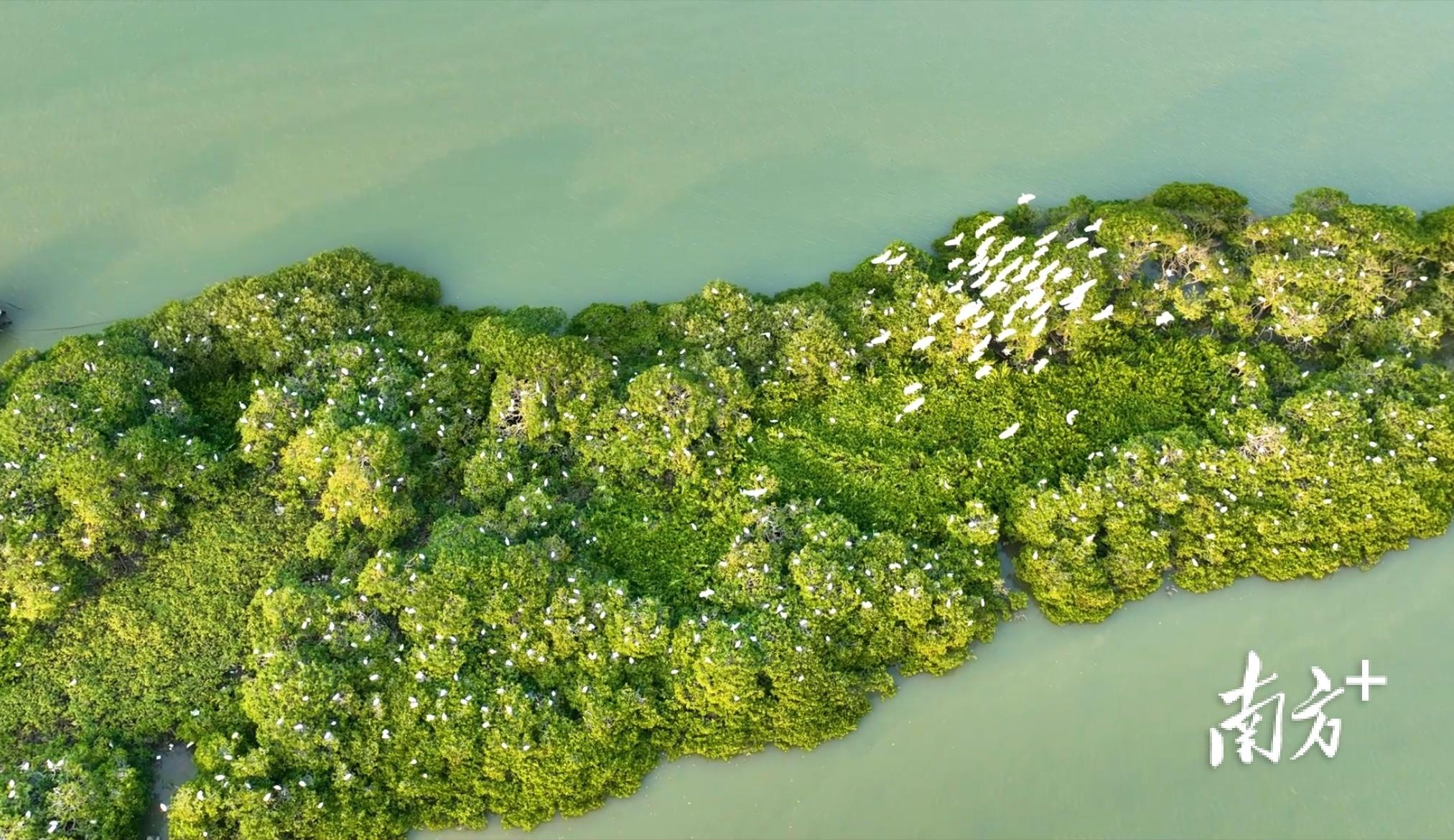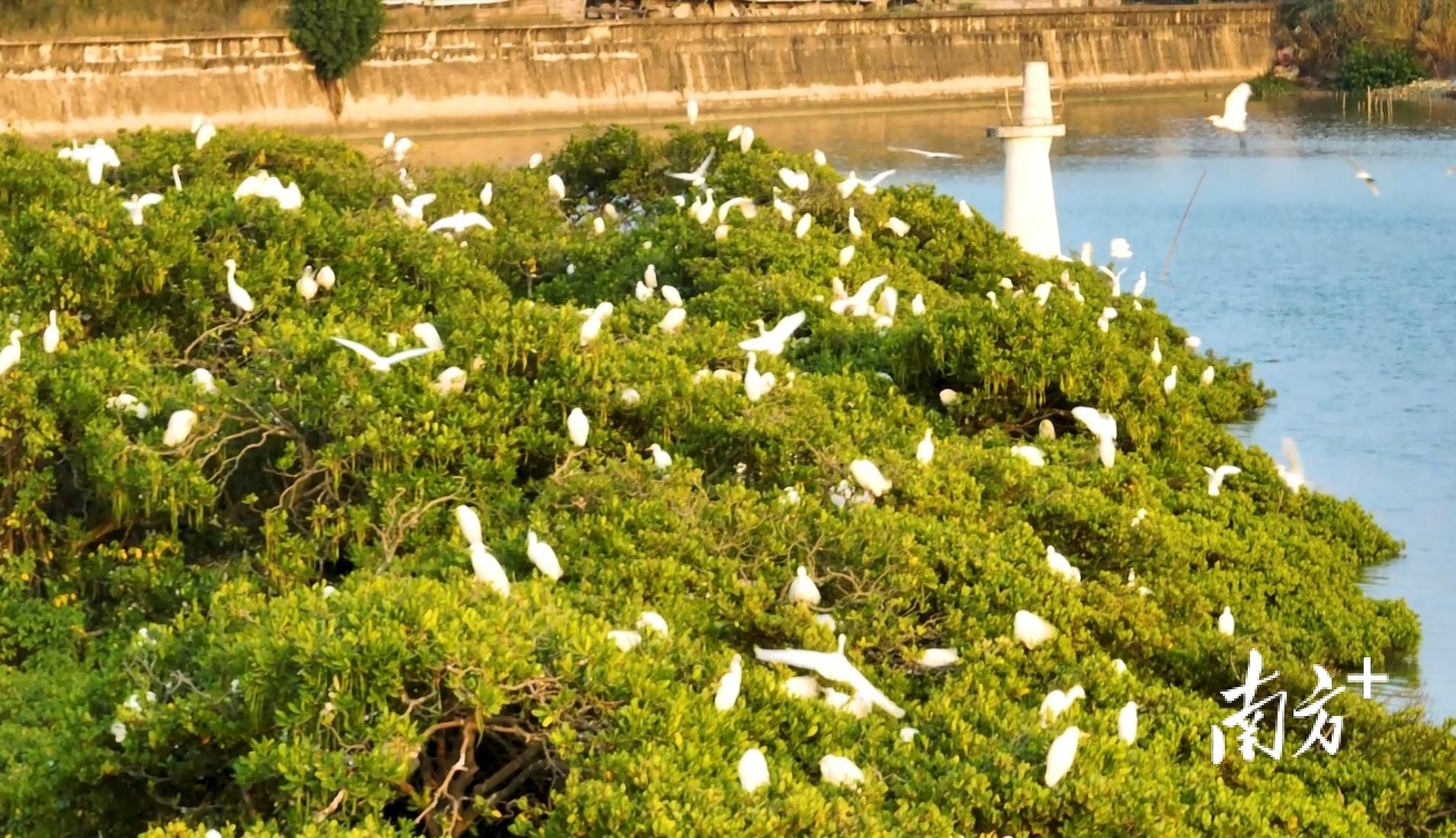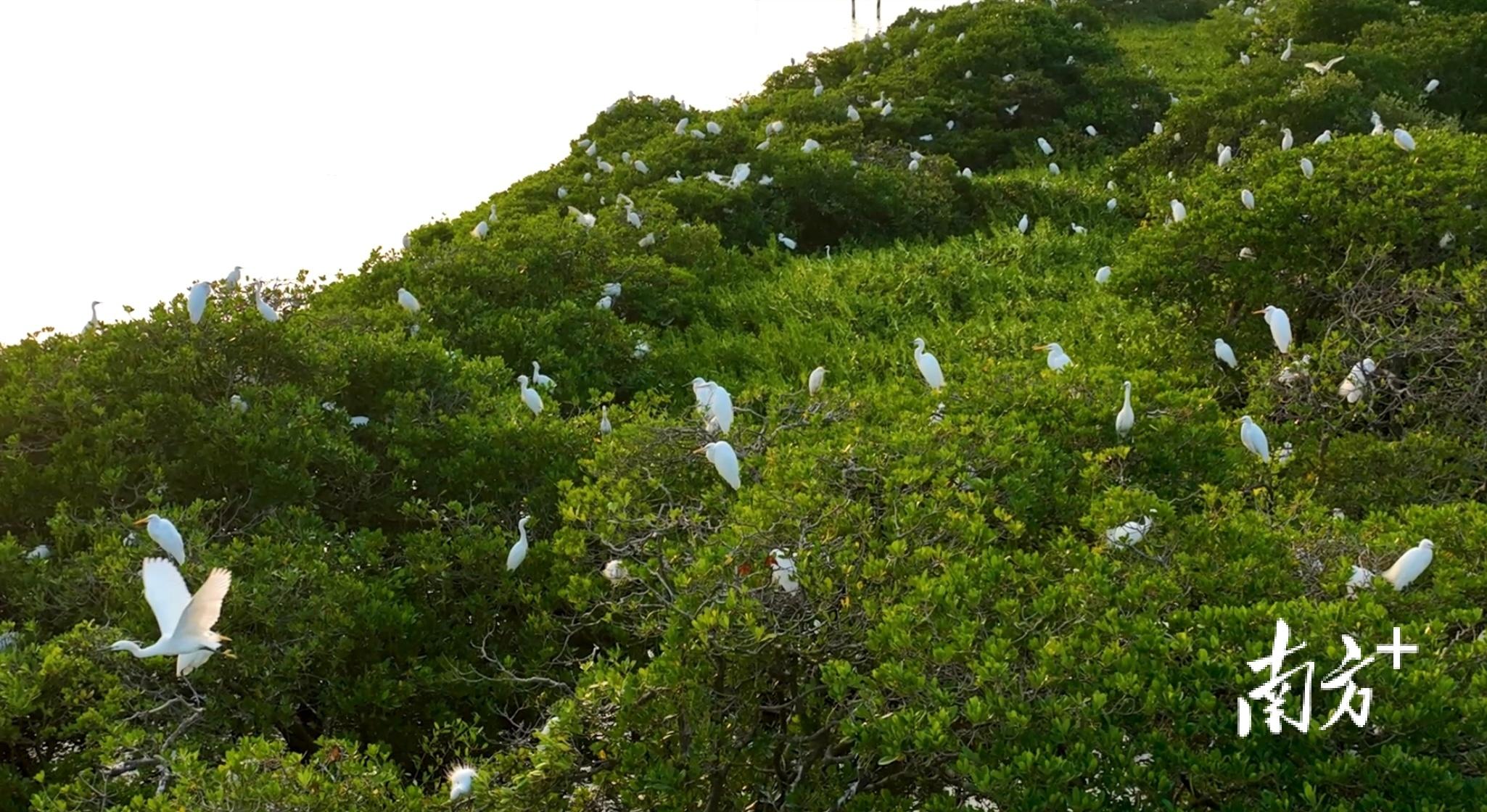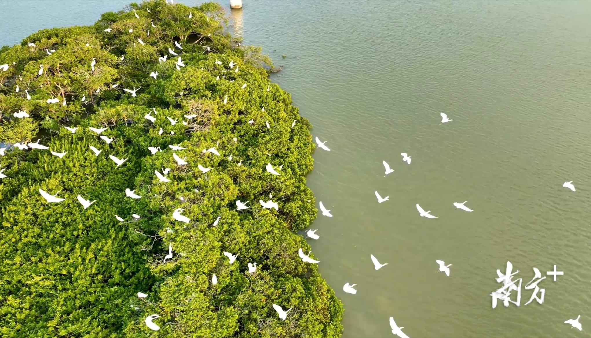 鸟树相依、万鸟飞翔……伴随着夕照,藏身于海面中央的红树林之间的鸟儿翩跹起舞,景象蔚为壮观,堪称“绿美濠江”新名片。