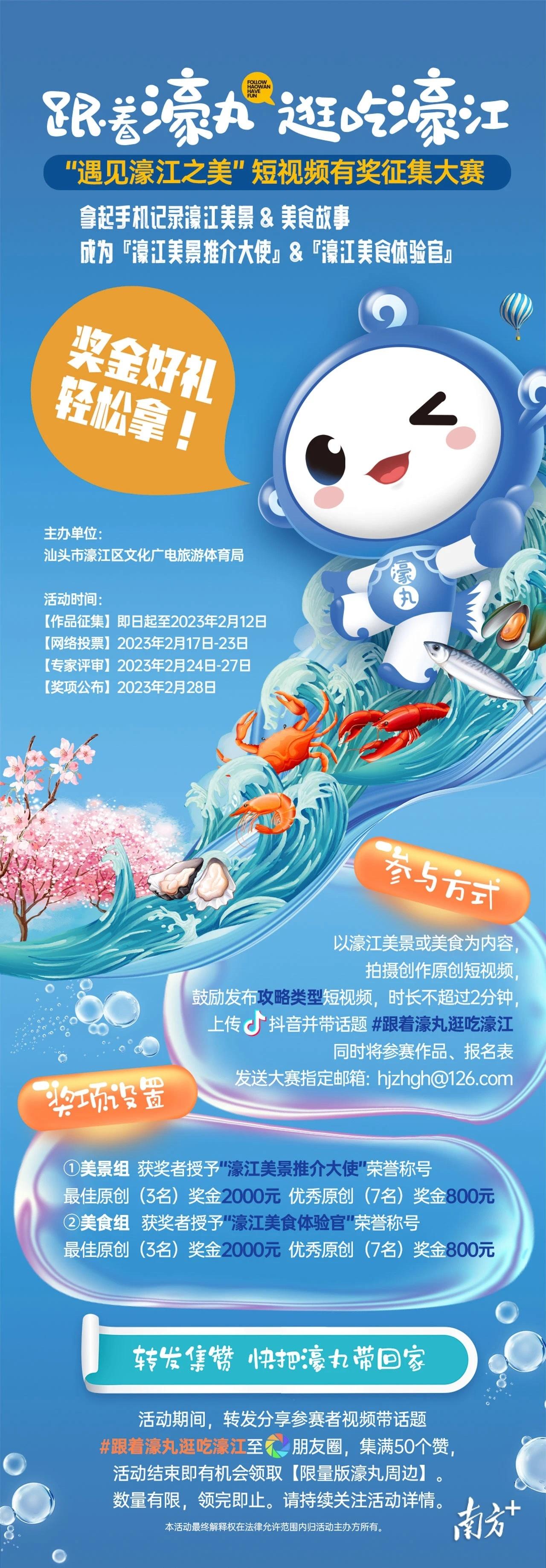 此外,春节期间,濠江区还将举行2023年迎春系列活动,包括文化集市、新春楹联书法展、迎春文化游园活动、南滨公园首届文化节等等,同时还有“跟着濠丸 逛吃濠江——‘遇见濠江之美’短视频有奖征集大赛”活动,通过征集市民群众拍摄的濠江美景美食短视频,充分展示濠江丰富的自然人文旅游资源和独特的美食文化,进一步擦亮“省级全域旅游示范区”金字招牌,提升濠江全域旅游品牌形象。