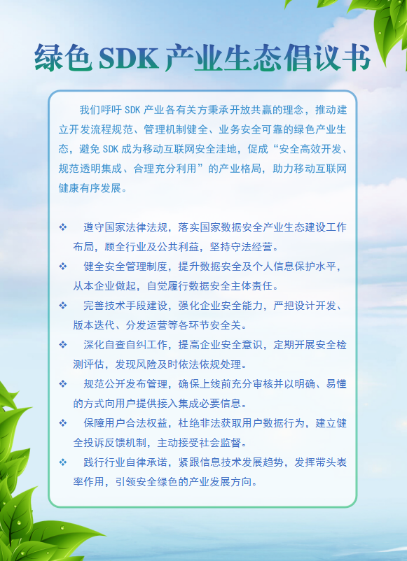 自2021年起,中国信通院就紧跟技术发展趋势,依托数据安全、移动安全等领域的深厚积累,发起了SDK安全专项行动。今年启动的“绿色SDK产业生态共建行动”,旨在助力移动互联网产业健康有序发展,促进SDK产品安全水平提升。未来,“绿色SDK产业生态共建行动”将秉承开放共赢的理念,通过宣传引导、标准编制、最佳实践遴选等系列工作,为推动合法、有序、健康的生态发展作出贡献。