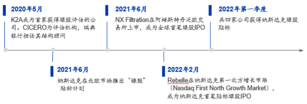 2021年6月,纳斯达克在欧洲推出“绿股”标签。同月,获CICERO“评绿”的过滤技术供应商NX Filtration在阿姆斯特丹泛欧交易所上市。今年2月,德国电商企业Rebelle在纳斯达克北欧交易所上市,成为纳斯达克首笔绿股IPO。共有四家公司在今年一季度获得了纳斯达克绿股贴标。
