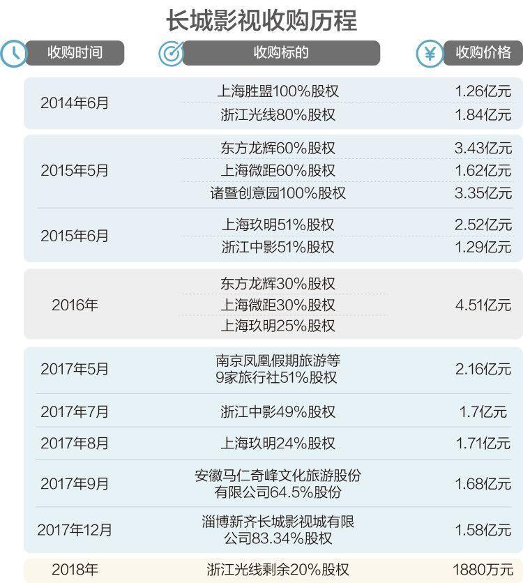 记者注意到,2014年以后,长城影视开始不断收购广告行业及文旅行业资产,包括以1.4亿、1.84亿元收购上海胜盟100%股权、浙江光线80%股权,切入电影院线广告和电视台广告代理业务。2015年,长城影视通过支付现金的形式收购了广告公司东方龙辉60%股权、上海微距60%股权、上海玖明51%股权、浙江中影51%股权,以及影视旅游文化创意园运营公司诸暨创意园100%股权。五笔股权收购耗资共计12.21亿元,均为公司自筹资金。
