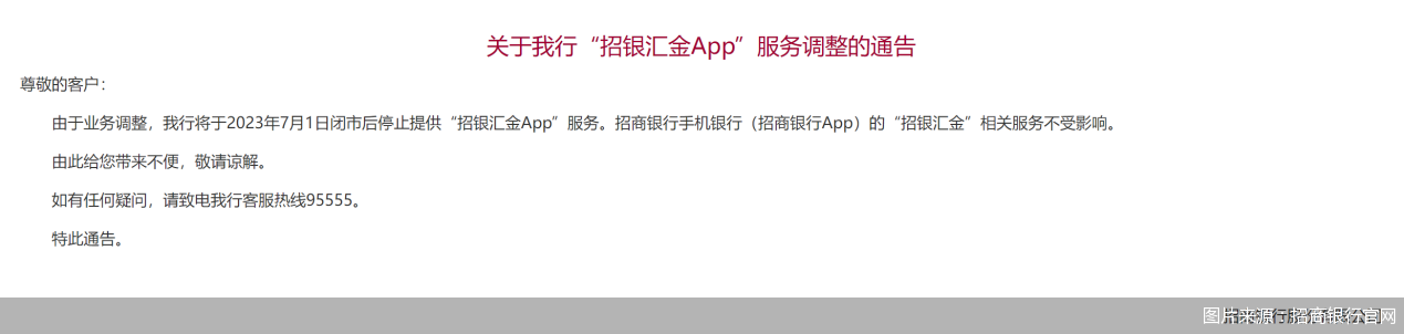 又有银行在手机App方面做了“减法”。6月11日,北京商报记者注意到,近日,招商银行发布《关于我行“招银汇金App”服务调整的通告》表示,由于业务调整,该行将于2023年7月1日闭市后停止提供“招银汇金App”服务。