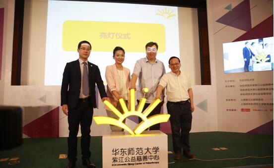 亮灯仪式(从左往右):上海紫竹高新区(集团)有限公司常务副总经理夏光先生;上海紫江公益基金会秘书长陈琳女士;北京恩玖非营利组织发展研究中心暨基金会中心网执行副理事长程刚先生;华东师范大学社会发展学院院长文军教授