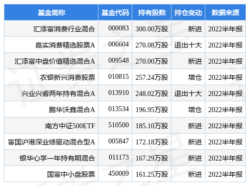 根据2022半年报公募基金重仓股数据,重仓该股的公募基金共434家,其中持有数量最多的公募基金为汇添富消费行业混合。汇添富消费行业混合目前规模为207.85亿元,最新净值6.295(9月26日),较上一交易日上涨1.47%,近一年下跌16.92%。该公募基金现任基金经理为胡昕炜。胡昕炜在任的基金产品包括:汇添富价值创造定开混合,管理时间为2018年1月19日至今,期间收益率为68.47%;汇添富消费升级混合A,管理时间为2018年12月21日至今,期间收益率为99.71%;汇添富民安增益定开混合A,管理时间为2019年9月17日至今,期间收益率为30.16%。