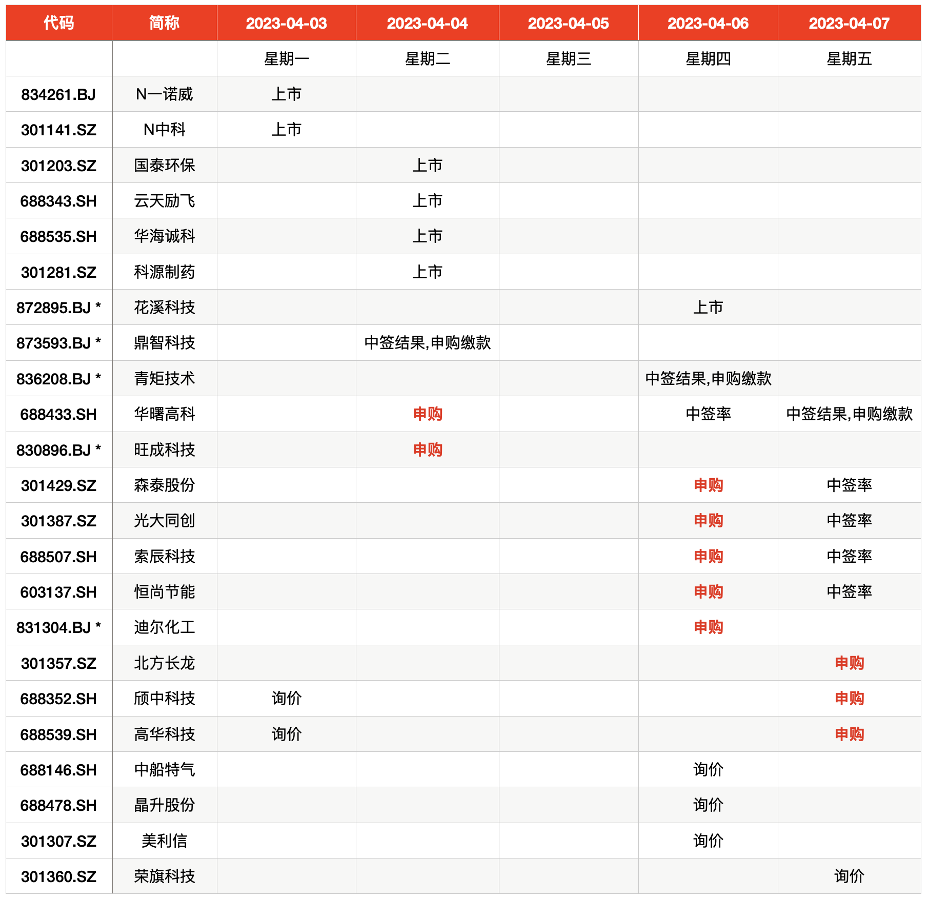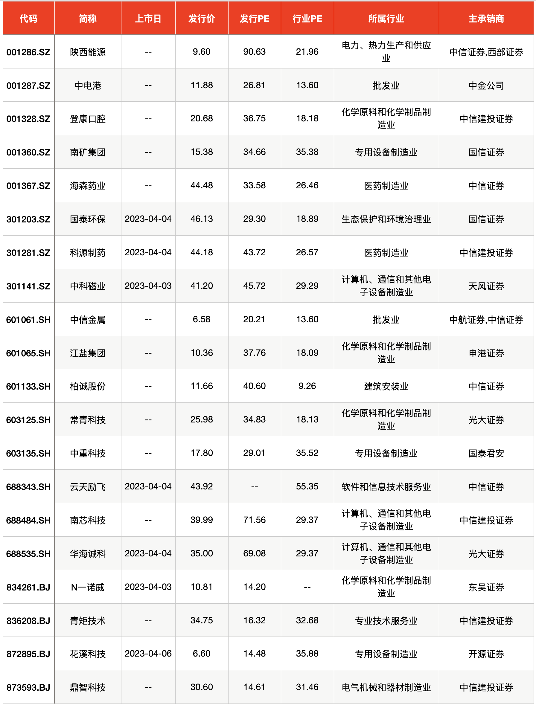周一(4月3日)共有2只新股计划上市,分别为山东一诺威聚氨酯股份有限公司(简称“一诺威”,834261.BJ)、浙江中科磁业股份有限公司(简称“中科磁业”,301141.SZ);周二(4月4日)共有4只新股上市,分别为杭州国泰环保科技股份有限公司(简称“国泰环保”,301203.SZ)、深圳云天励飞技术股份有限公司(简称“云天励飞”,688343.SH)、山东科源制药股份有限公司(简称“科源制药”,301281.SZ)、江苏华海诚科新材料股份有限公司(简称“华海诚科”,688535.SH);周四(4月6日)上市的新股则为新乡市花溪科技股份有限公司(简称“花溪科技”,872895.BJ)。
