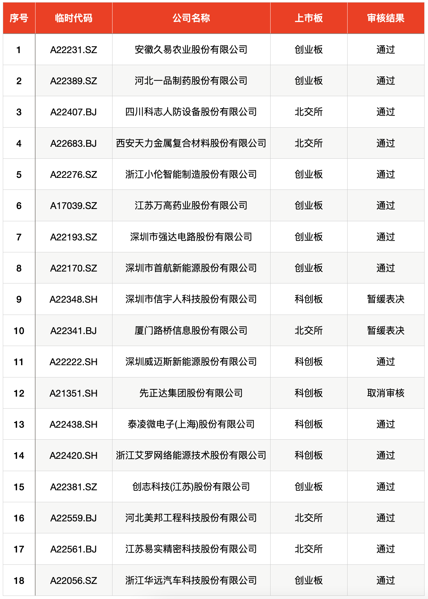 发审委审核方面,上周共有18家企业首发过会,其中15家企业获通过,2家企业暂缓表决,1家企业取消审核。