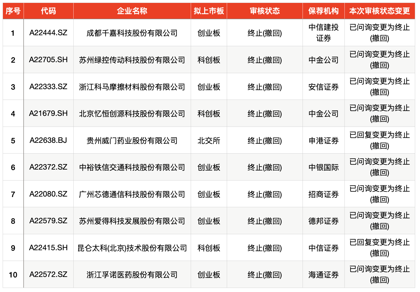 上周共有10家企业终止IPO,其中8家企业在被问询后为主动撤回IPO材料,2家企业在问询回复后主动撤回IPO材料。