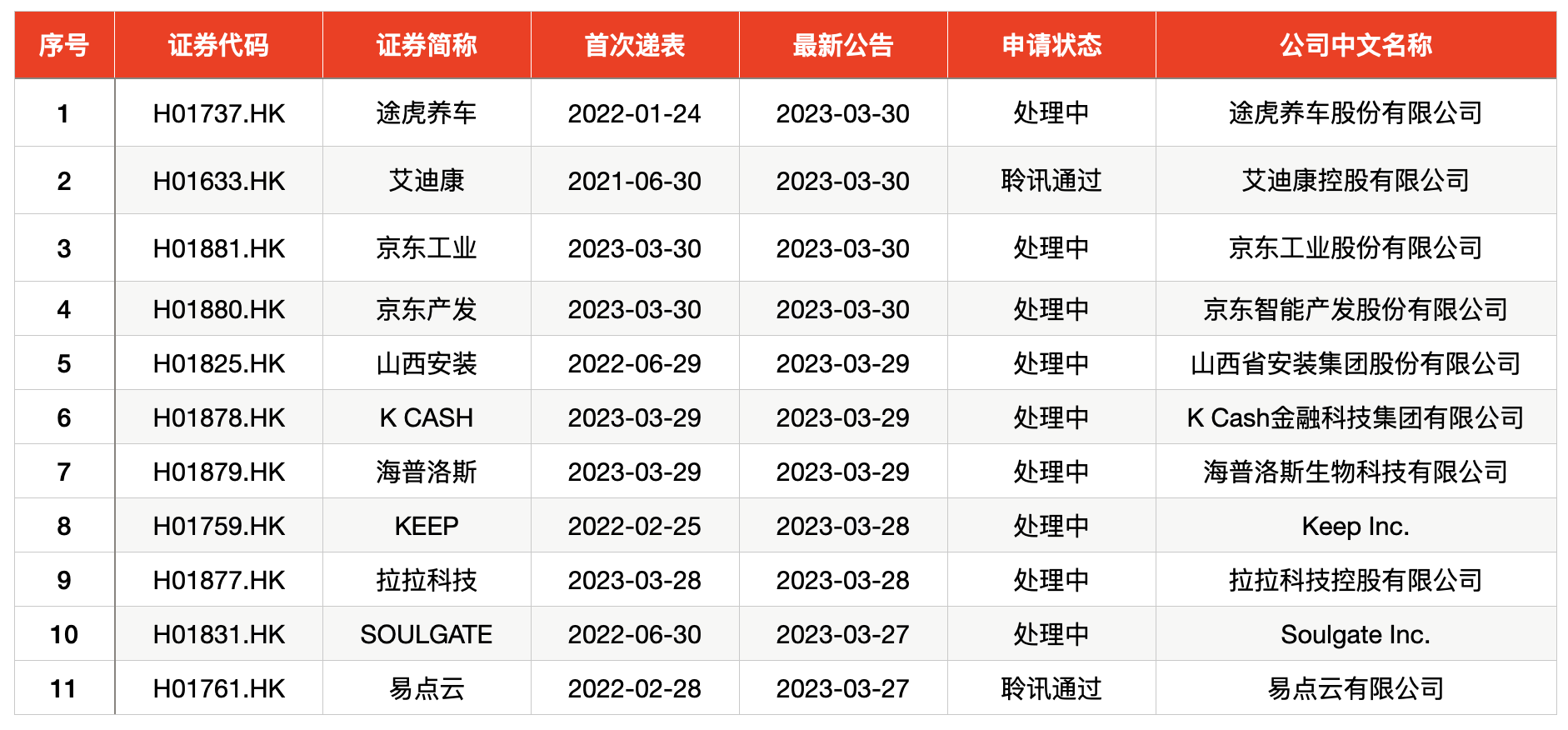 上周,共有2家企业通过聆讯,为艾迪康控股有限公司、易点云有限公司,以及共有9家企业向港交所递交招股申请书,其中,Keep、途虎养车、Soul等4家企业更新了招股书,货拉拉、京东工业、京东产发等5家企业首次向港交所递交招股书。
